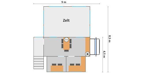 Breite / Width: 5 m mit ausgefahrener Schublade und 10 m mit Zelt